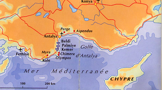 En TURQUIE, sur la côte méditerranéenne, à 50 km au sud-ouest d'ANTALYA.